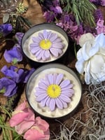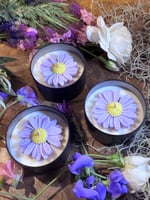 Our daisy flower scented candles are hand poured by me. Made with phthalate and parabens-free fragrance oils and a clean burning cotton wick inside a a matte black tin. 20+ hour burn.